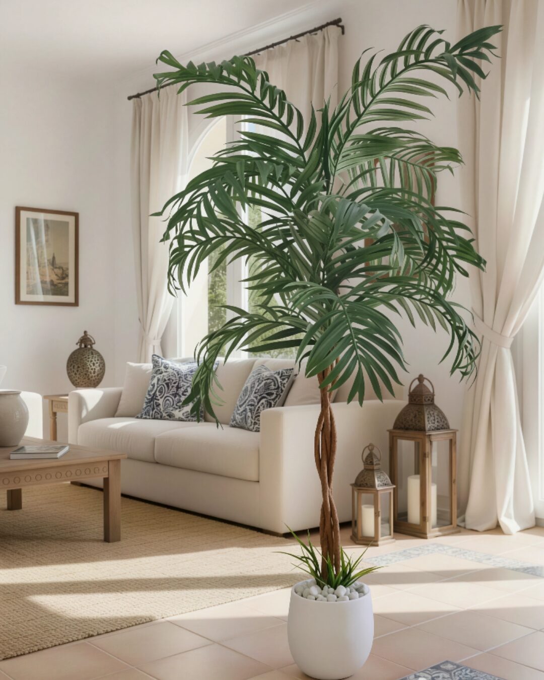 - Espace de Vie : Placez ce palmier dans un coin de votre salon pour créer un point focal naturel. Associez-le avec des meubles en bois clair et des éléments décoratifs en osier pour une ambiance chaleureuse.